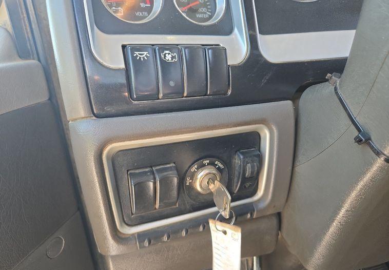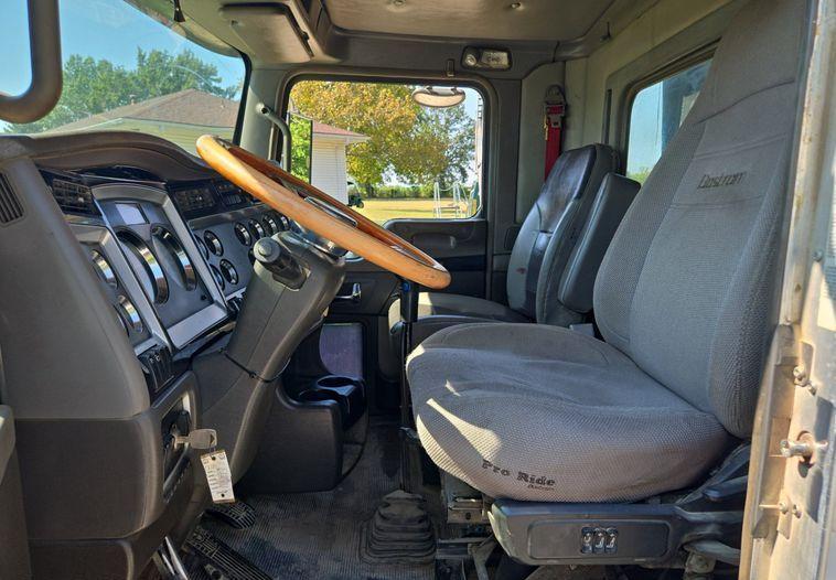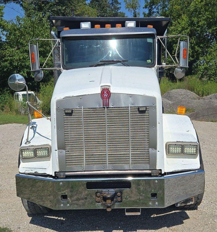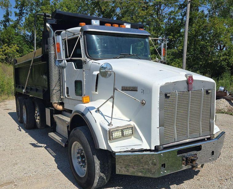 The 2010 Kenworth T800 dump truck has 588,527 miles on the odometer and 29,012 hours on the meter. It is powered by a Cummins ISM 10.8L six-cylinder diesel engine with engine brake. The transmission is Eaton manual. The chassis has triple axles with a pusher axle and inter-axle differential lock. Suspension is spring over walking beam with air brakes. It is equipped with a PTO. The GVWR is 67,020 pounds, and the lift axle GAWR is 19,000 pounds.