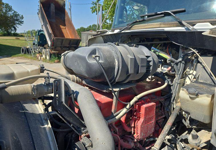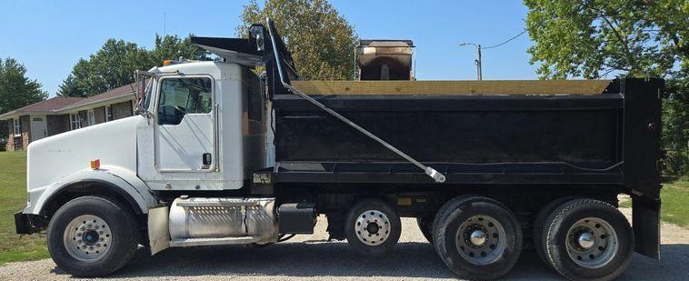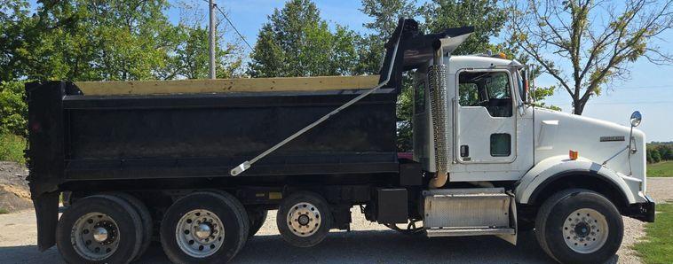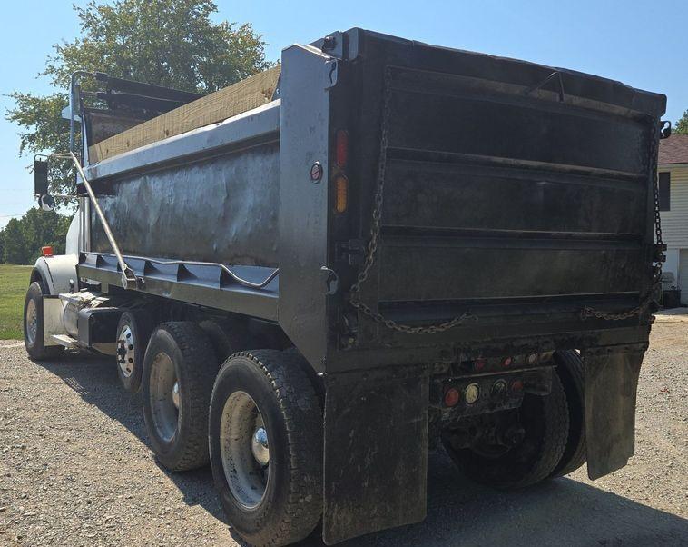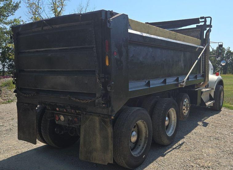 The dump bed measures 16 feet long by 8 feet wide with a 40-inch side height and 8-inch side board height. The bed is steel with a roll tarp, single ram, and an air-operated end gate.